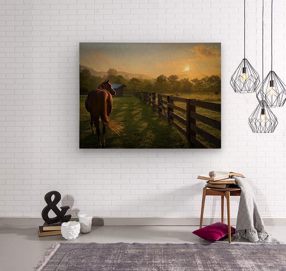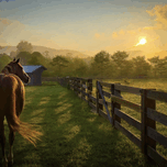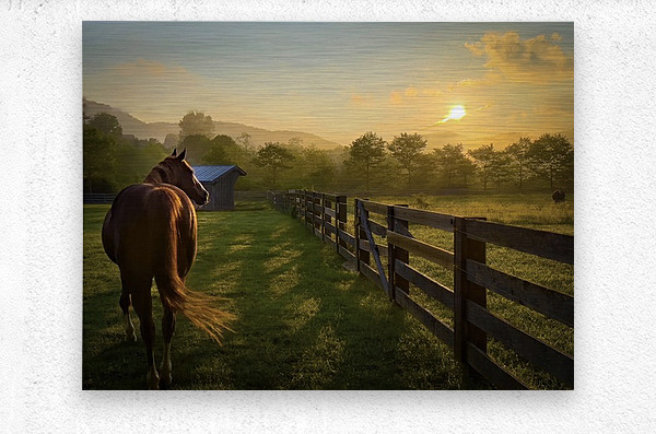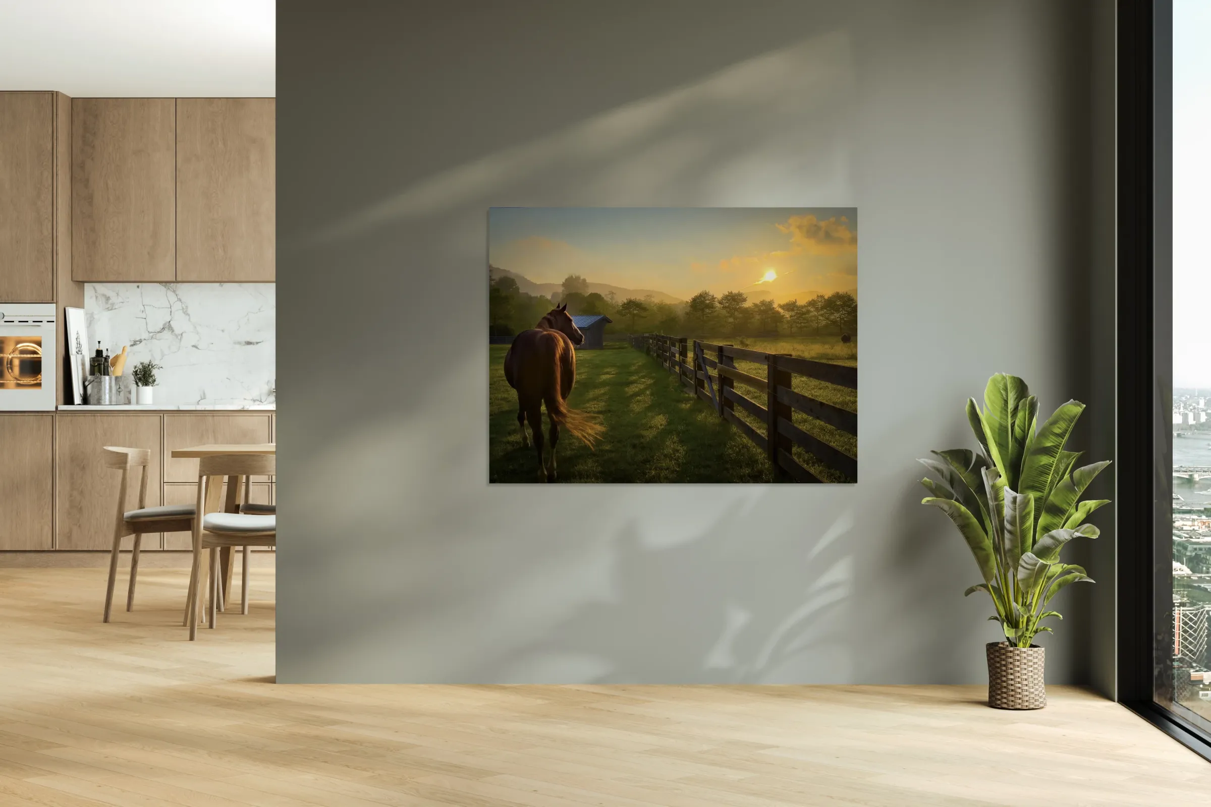 In the stillness ofDawn , a lone horse,Harly and Bull companion graze besides a weathered fence, both gone, living on only in this morning light